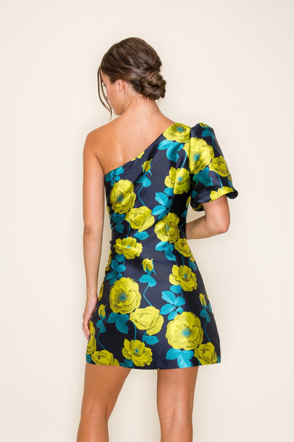 Turn heads in the Astoria One Shoulder Mini Dress, where bold navy meets zingy lime in a playful jacquard pattern. Its puff sleeve adds flirty volume while the one-shoulder design keeps it effortlessly chic. Perfect for parties or nights out, this mini dress combines fun style with a flattering fit to make your look unforgettable.