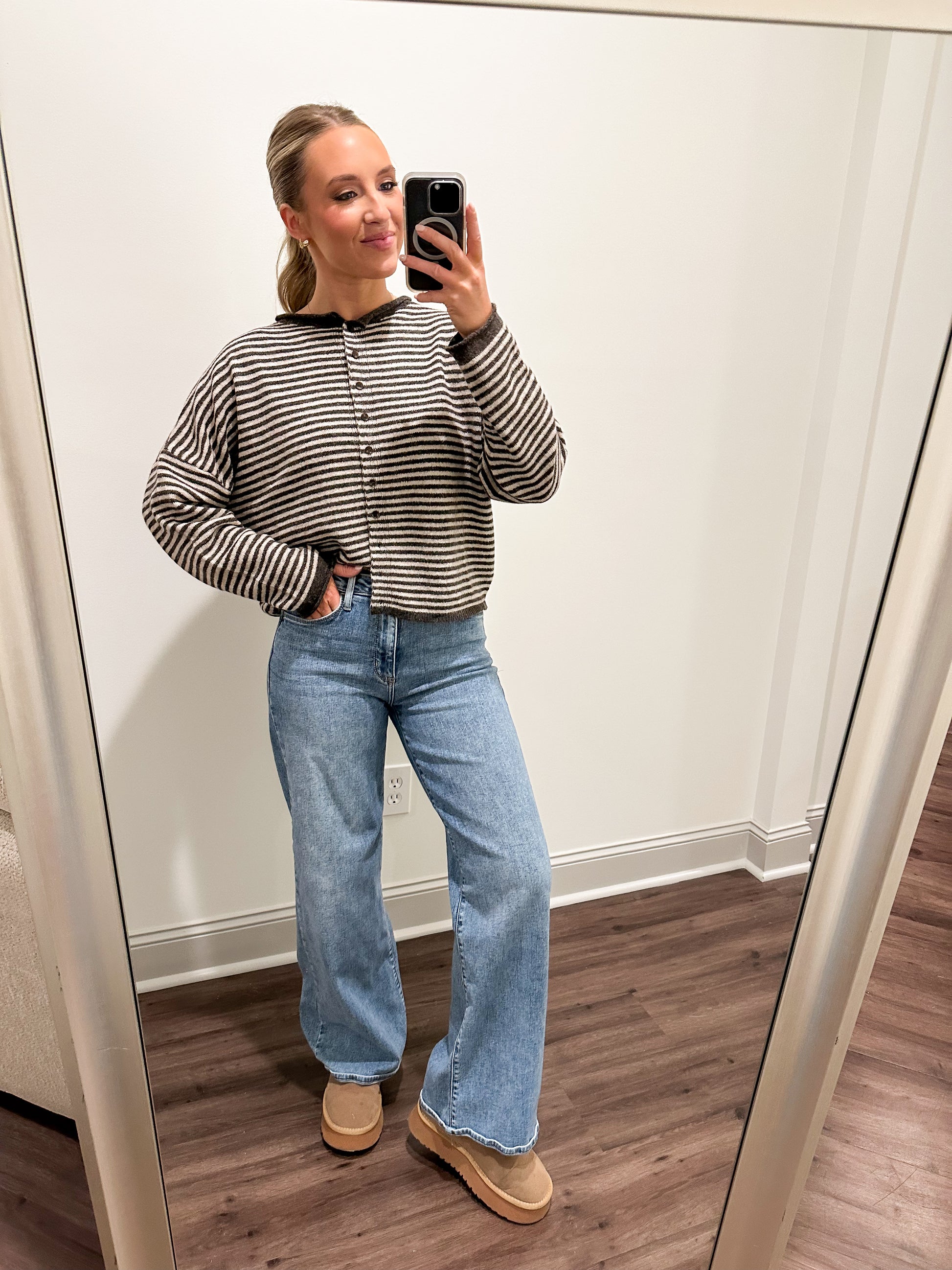Cozy up in this effortlessly cool cardigan that's equal parts comfort and style! Featuring a relaxed drop shoulder silhouette, round neckline, and button-down front, it's your new go-to layering piece. The striped knit pattern adds visual interest while the raw edges give it an undone, modern vibe. Crafted from a thoughtful wool blend with recycled polyester, this long-sleeved sweater keeps you warm without the guilt. Perfect for throwing over anything in your closet.