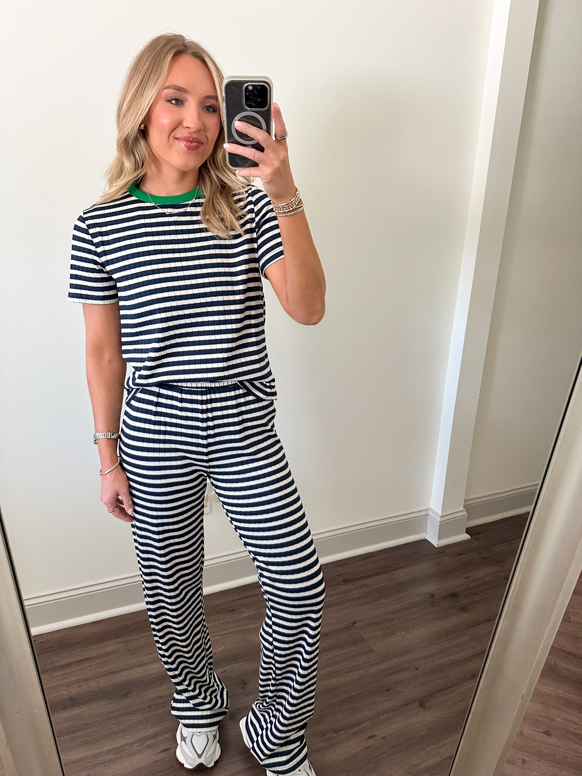 This Freddie Set in Light Blue is your new go-to for cozy days. The soft, striped top features a playful contrast collar that adds a fun twist, while the matching striped pants keep the look effortlessly coordinated. Perfect for lounging or casual outings, this set blends comfort and style in a lighthearted way.