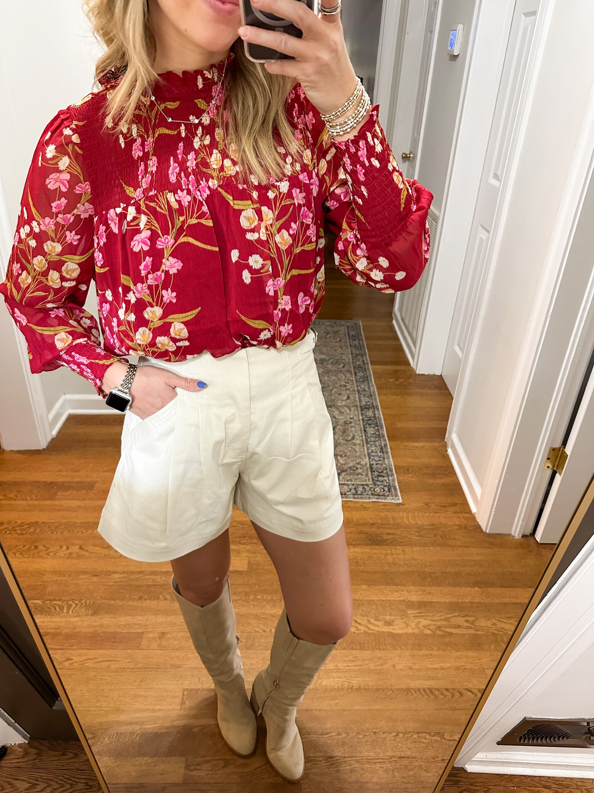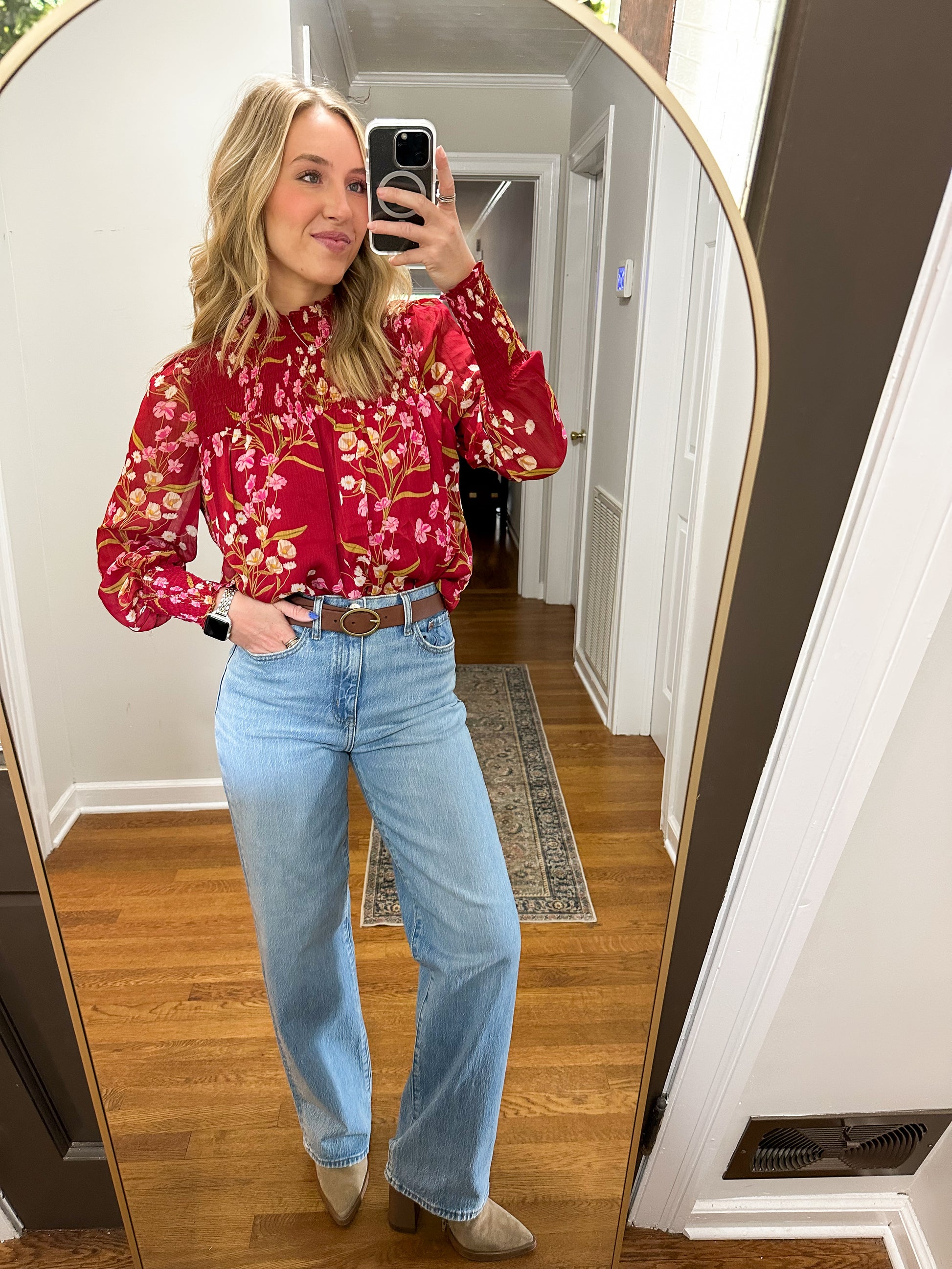Step out in style with the Ginnie Floral Sunnie Long Balloon Sleeve Blouse. Its sheer balloon sleeves and smocked cuffs bring a playful vibe, while the smocked neckline adds a chic touch. The burgundy floral print makes it easy to pair with black pants and brown heels for a fun, confident look that’s ready for any occasion. Fully lined for comfort, this blouse combines feminine details with effortless flair.