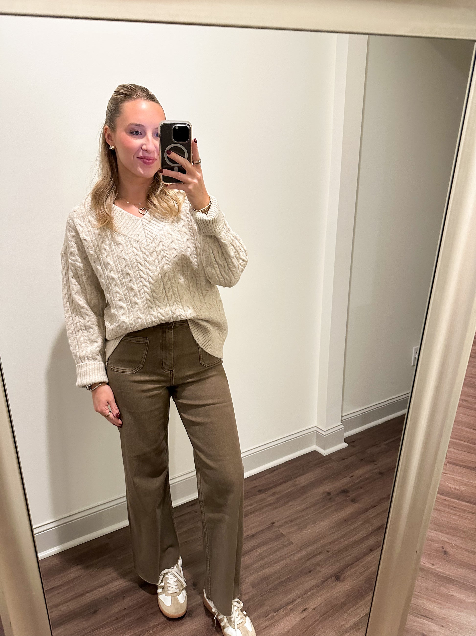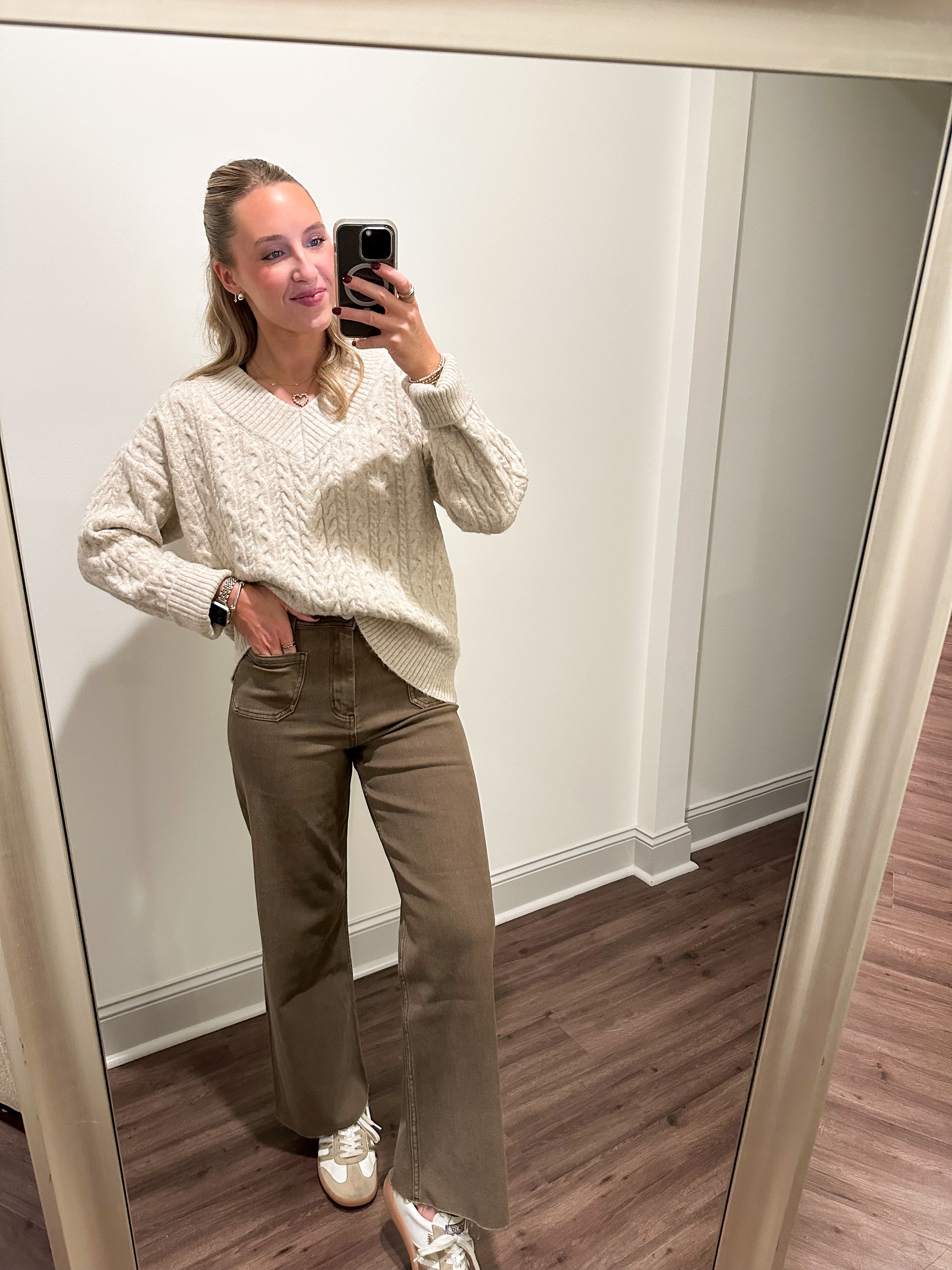Wrap yourself in cozy vibes with this V-neck cable-knit long sleeve top! The textured knit fabric and intricate cable patterns deliver that timeless, put-together look that never goes out of style. With its flattering V-neckline and soft, warm fabric, this versatile piece is your new go-to for layering or standalone wear. Whether you're heading to brunch, the office, or a casual hangout, this top brings effortless charm and comfort to every moment. Snuggle up in style!