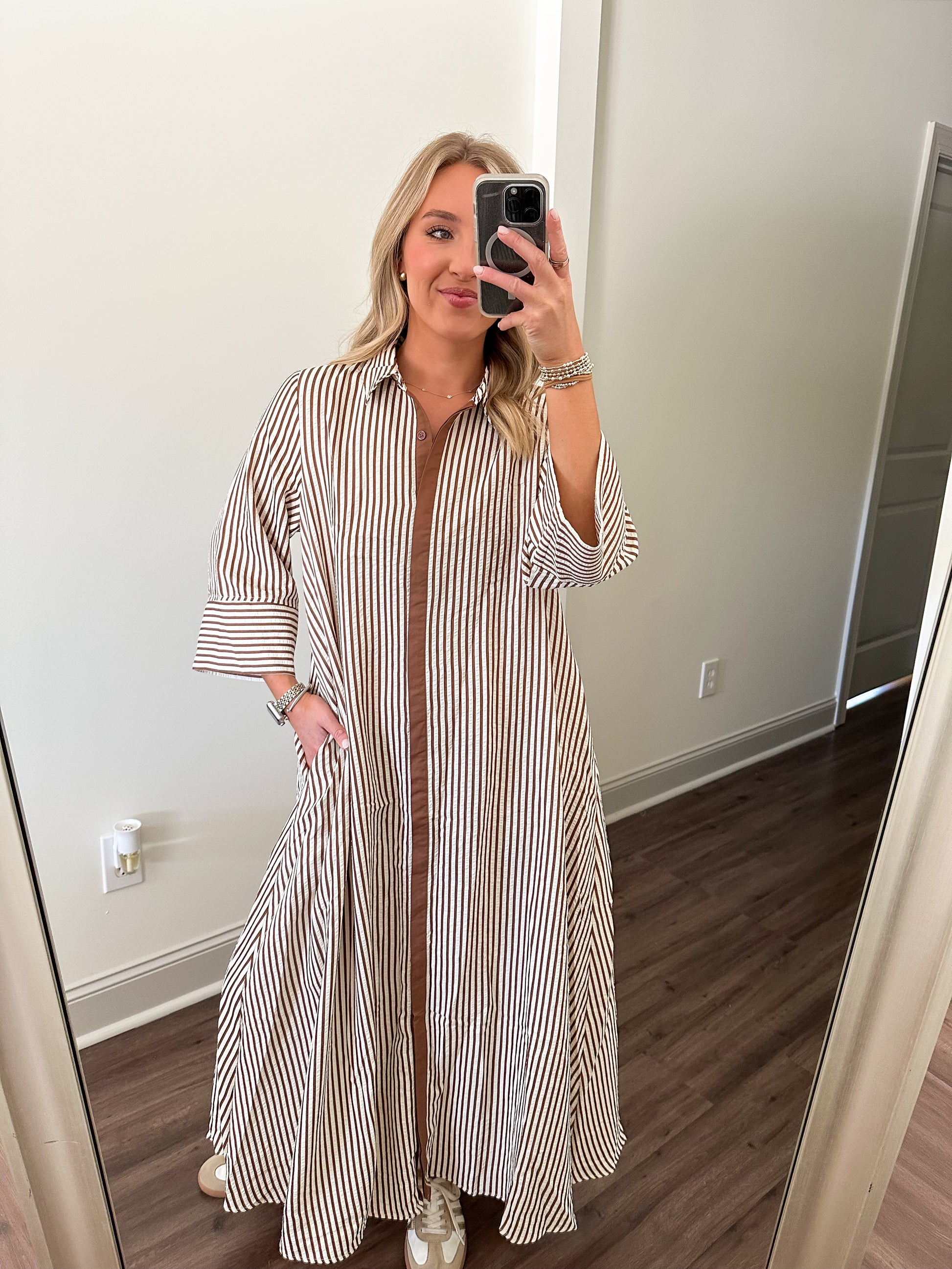 This playful striped midi dress brings effortless style with its 3/4 sleeves and a chic shirt collar. Lightweight and woven, it feels comfy all day while the hidden front buttons add a subtle surprise. Practical side pockets keep your essentials close, and the non-sheer fabric means no worries underneath. Perfect for those breezy days when you want to look cute and feel cool!