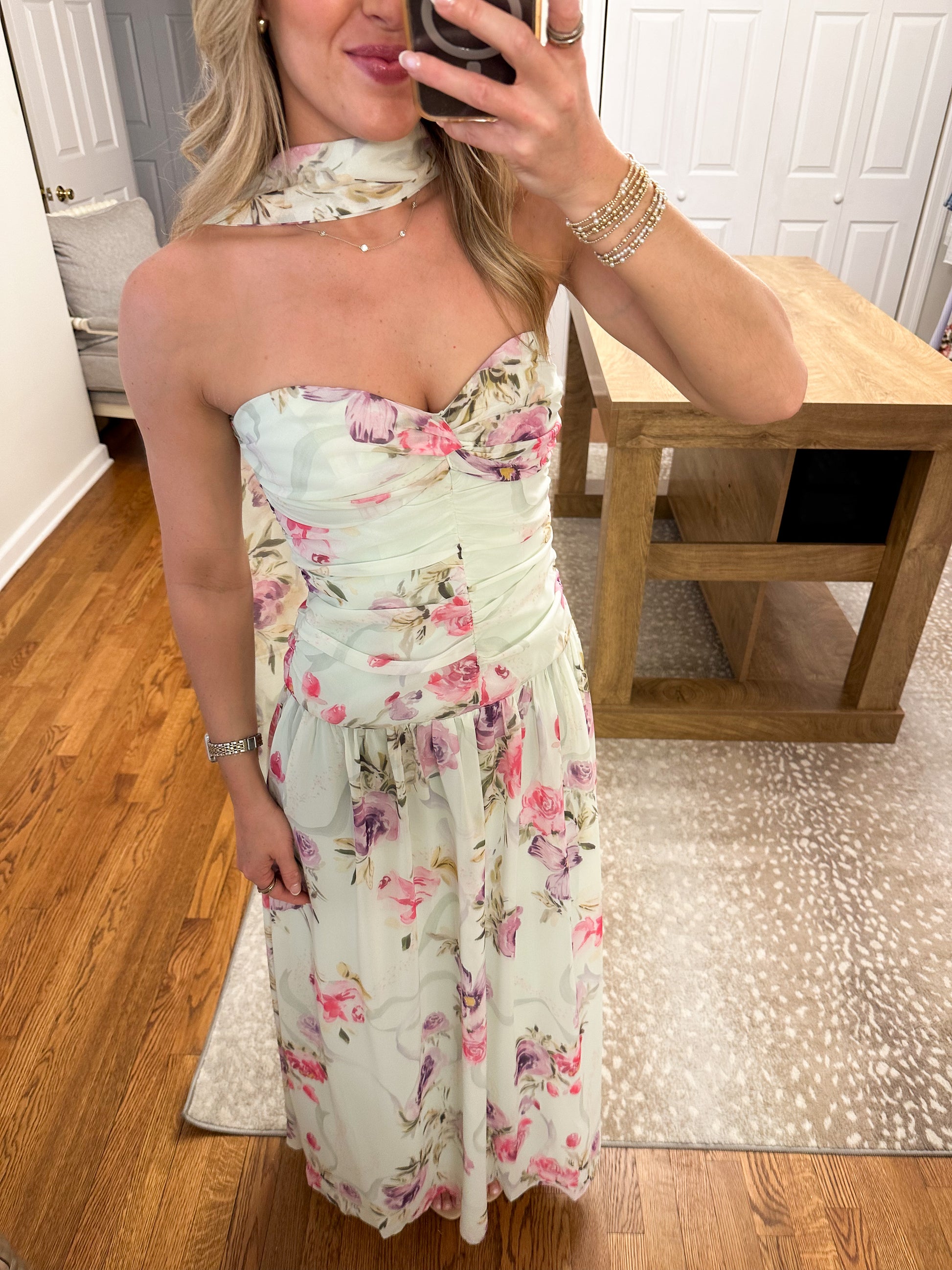 Elegant mint green maxi dress featuring a romantic floral print throughout. The strapless sweetheart bodice showcases a striking twist knot detail at the center, while a matching floral halter strap frames the neckline beautifully. Luxurious ruching from bust to waist creates flattering dimension and movement. Perfect for garden parties, weddings, or special occasions where you want to make a graceful impression.