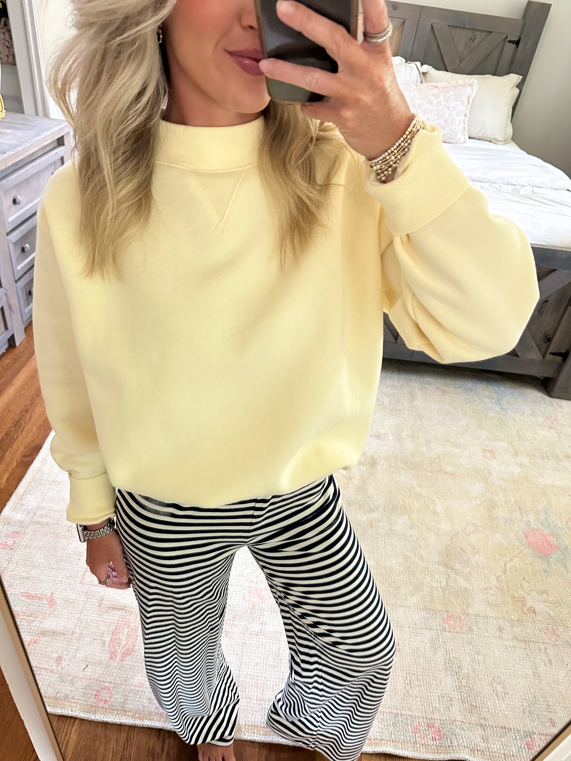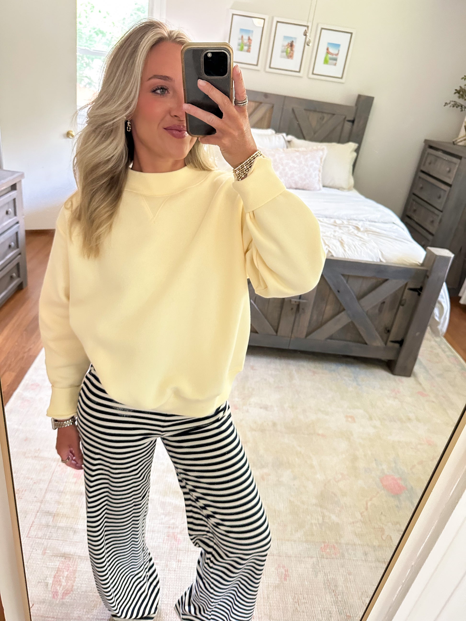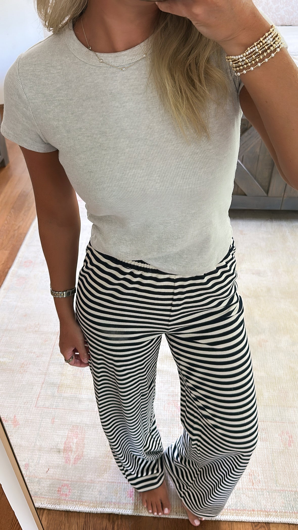 Get cozy in the Natalie Stripe Pants—featuring playful navy and white stripes and a comfy elastic waistband. Perfect for lounging or casual days, these pants combine cute style with all-day comfort.