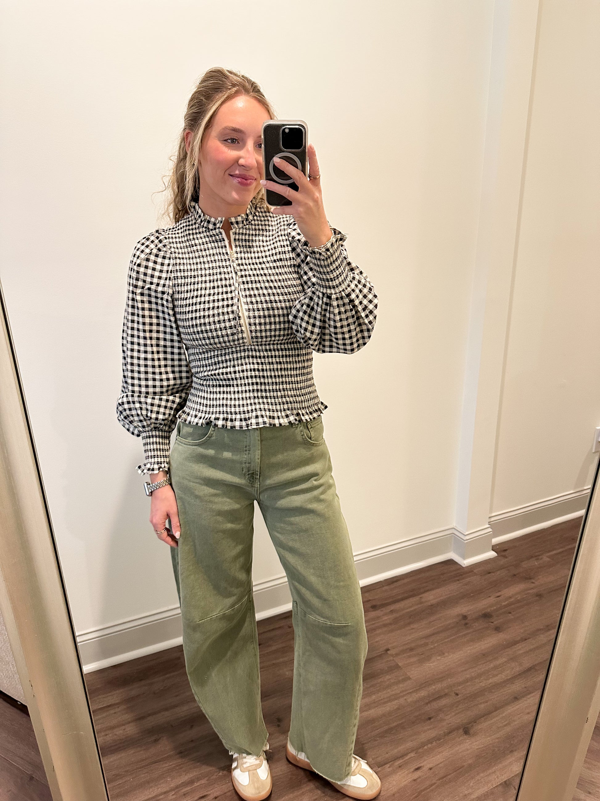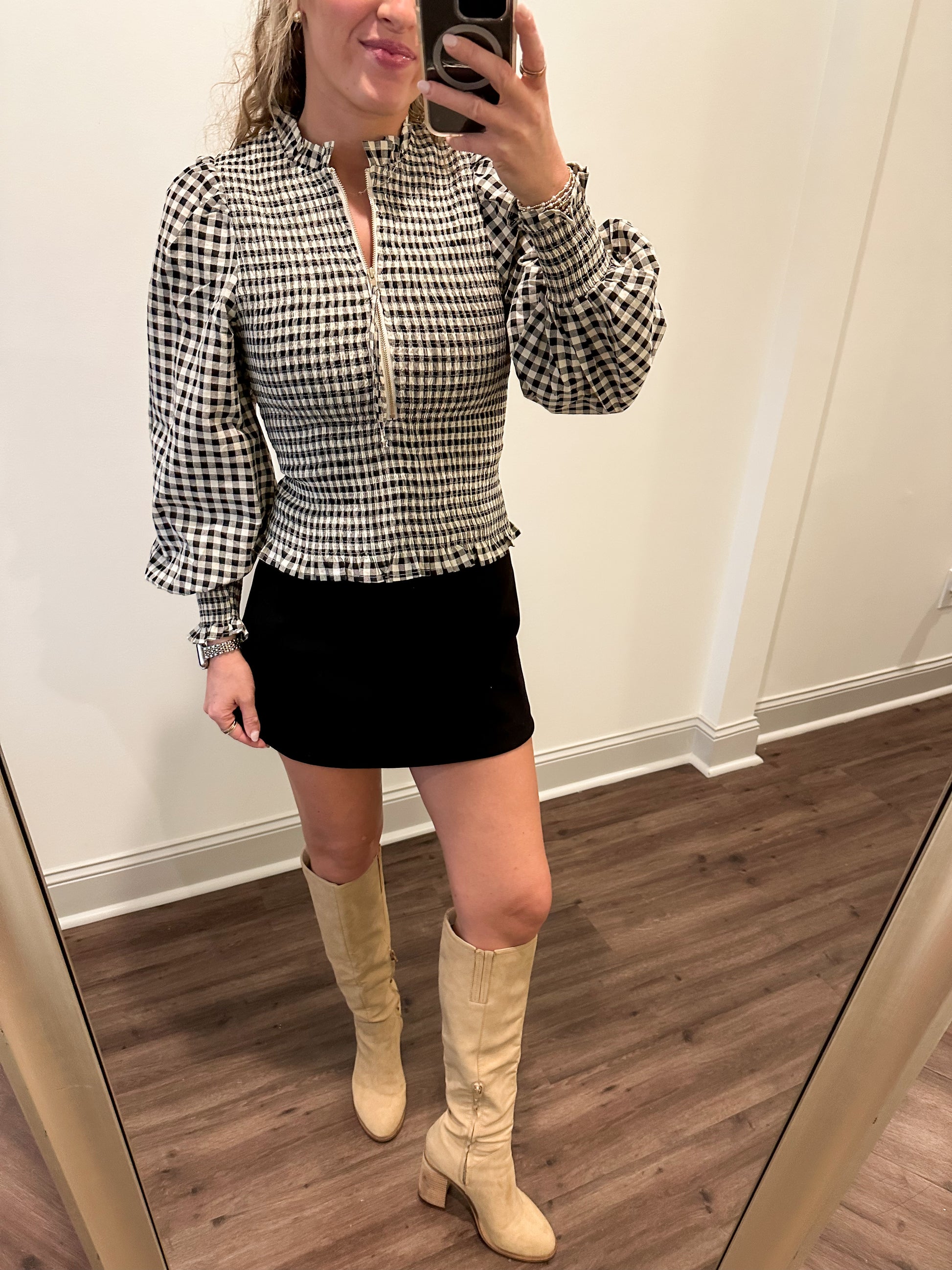 This gingham long puff sleeve top is a playful twist on classic charm. The smocked bodice hugs you comfortably while the ruffle hem adds a flirty flair. With a convenient front zip closure and lightweight woven fabric that isn’t sheer, it’s perfect for breezy days full of fun. Unlined for easy-wear, this top brings sweet style with a pop of personality.