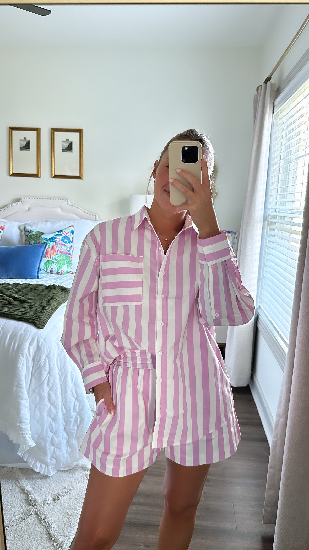 - Striped oversize button up long sleeve top with matching boxer shorts with elastic waistband and side pockets!