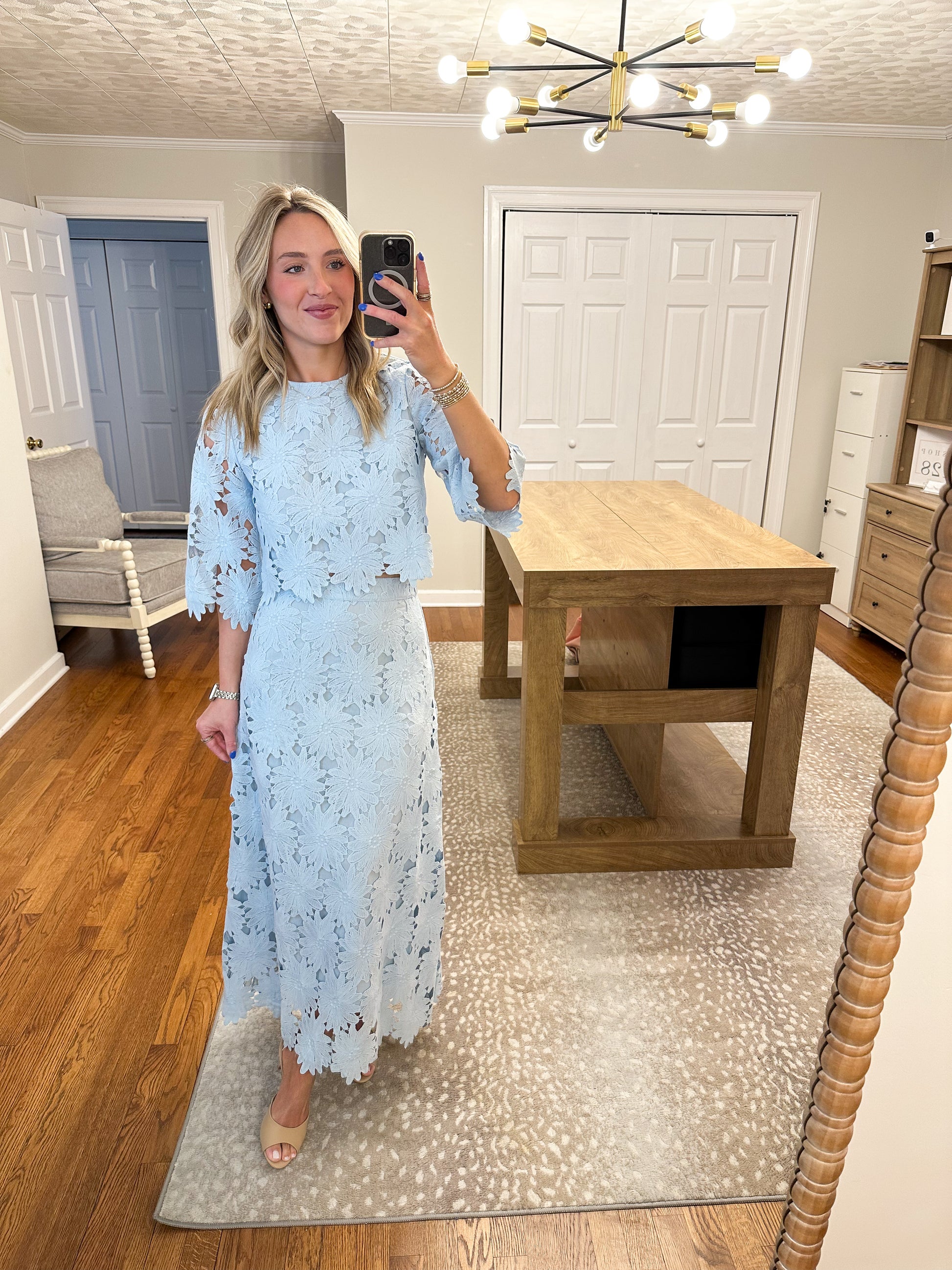 Embrace effortless elegance with The Meadow Bloom Set in a serene light blue. This charming two-piece features a midi skirt with a convenient side zipper and delicate embroidered floral overlay that adds romantic flair. Pair it with the matching long-sleeve top for a coordinated look that transitions seamlessly from day to night. Perfect for anyone seeking a playful yet polished ensemble that celebrates nature-inspired style.