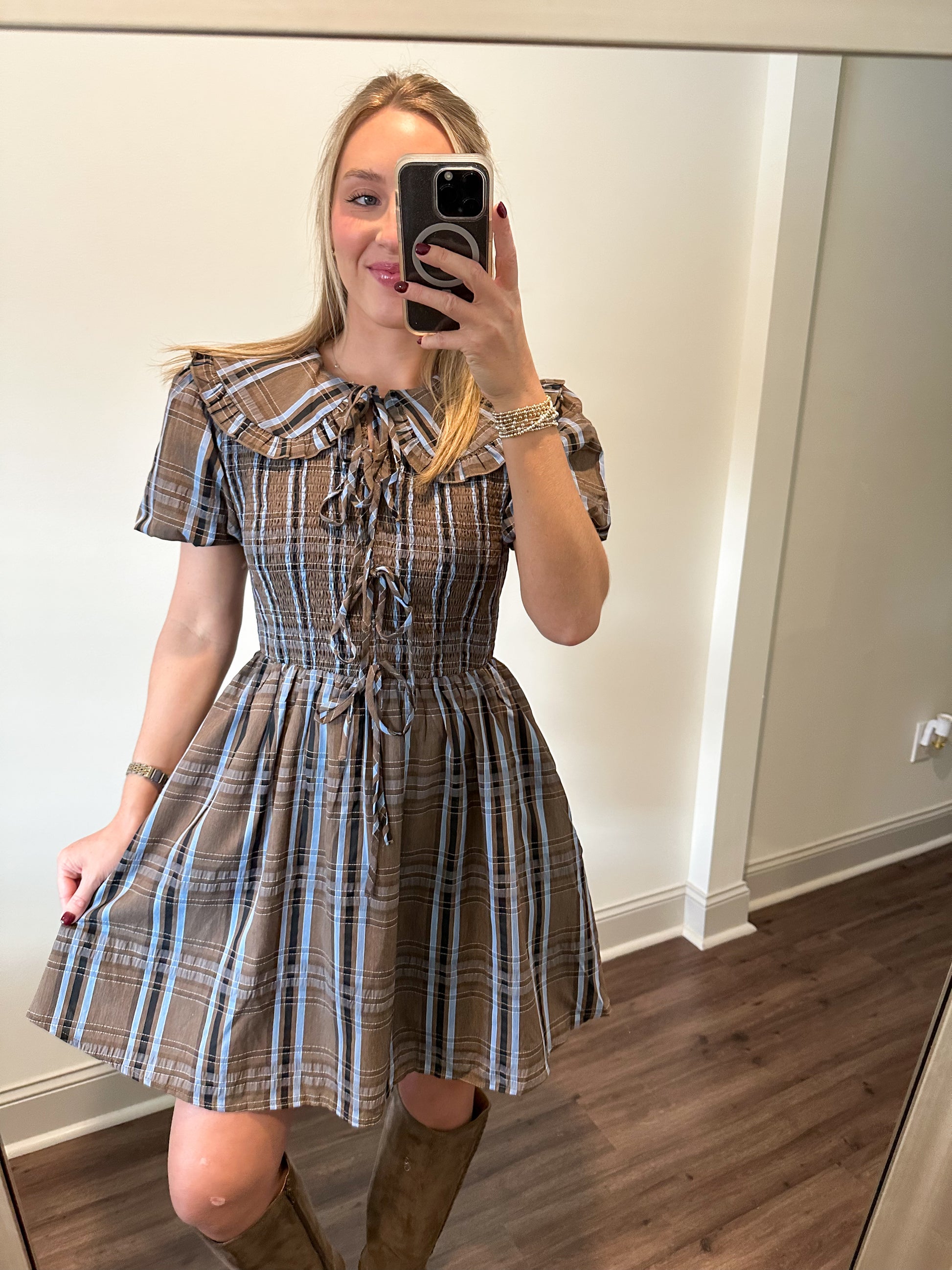 Elevate your fall wardrobe with this charming plaid mini dress featuring a playful Peter Pan collar and adjustable tie details. The smocked bodice creates a flattering silhouette while adding vintage-inspired flair. Pair it with tall boots for an effortlessly chic look that works for everything from casual outings to weekend adventures. The brown and blue plaid pattern brings timeless appeal with a modern twist.